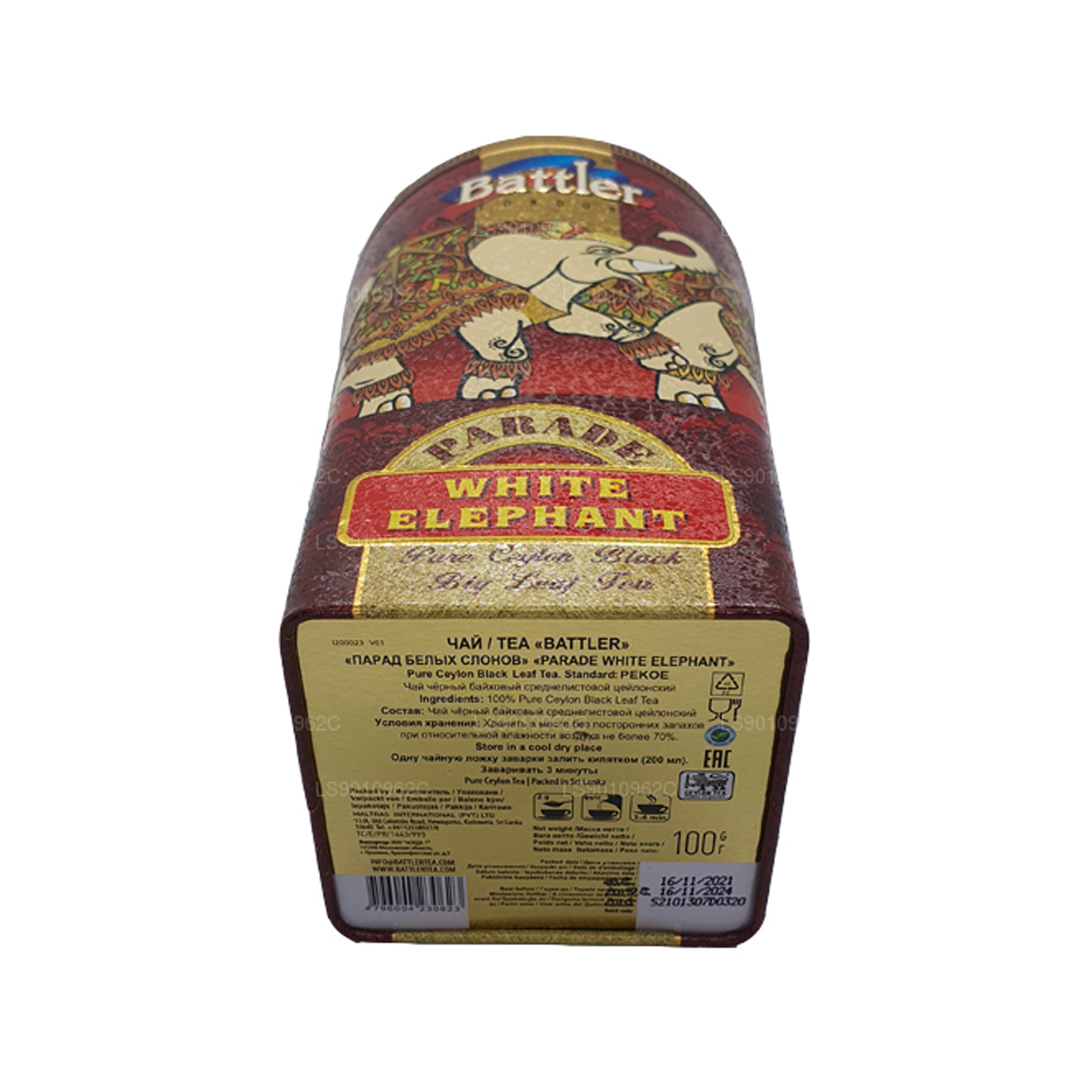 Battler Parade White Elephant is een hoogwaardige zwarte thee uit Ceylon, gemaakt van zorgvuldig gerolde hele bladeren van Pekoe-kwaliteit volgens de traditionele orthodoxe methode. Deze blend behoudt de natuurlijke essentie van de thee en biedt een zachte kop met een middelmatige smaak met een rijke amberkleurige likeur en een zacht, rond karakter. Elegant verpakt in een blikje van 100 g en verzegeld in een zakje van aluminiumfolie, zorgt het voor blijvende frisheid en verfijnde kwaliteit, waardoor het een perfecte keuze is voor theekenners. Gemaakt met 100% pure zwarte Ceylon-thee (PEKOE