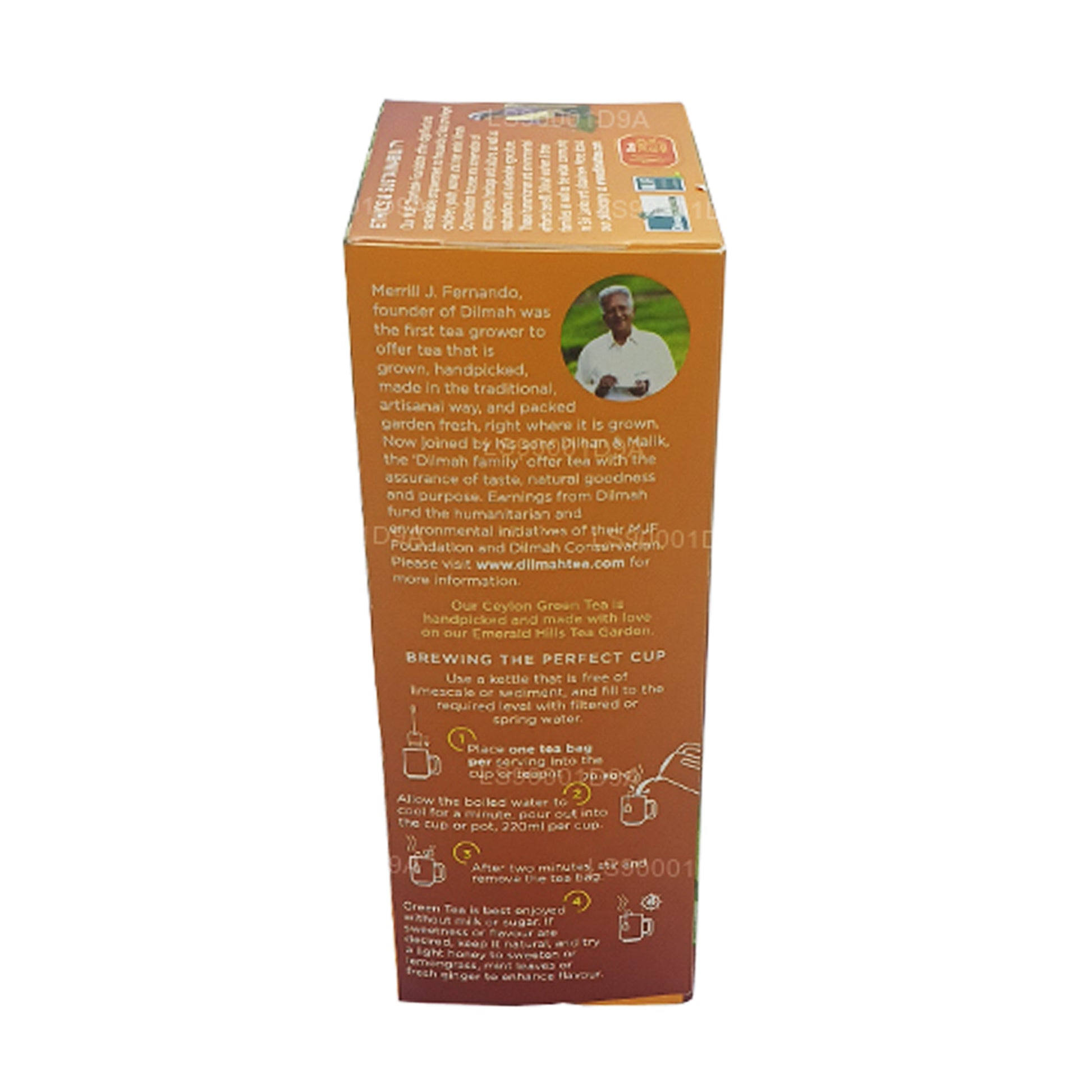 (SKU: LS90001D9A) Hoog gegroeid in de ongerepte centrale hooglanden van het oude Sri Lanka, misschien wel een van de beste theeteeltgebieden op aarde. Onze groene theebladeren zijn gemaakt met traditionele en duurzame methoden en worden met de hand geplukt om ervoor te zorgen dat ze vrij blijven van onzuiverheden en dat hun natuurlijke goedheid in elk kopje zit.Een heldere groene thee van Ceylon in een sprankelende combinatie met munt- en groene muntblaadjes. Heerlijk muntachtig, met een verfrissende geur en verleidelijke natuurlijke smaken van pepermunt en groene munt. Dilmah Pure Ceylon groene thee met Marokkaanse munt bestaat uit 20 theezakjes in een luchtdicht foliezakje, waardoor smaak en smaak worden beschermd