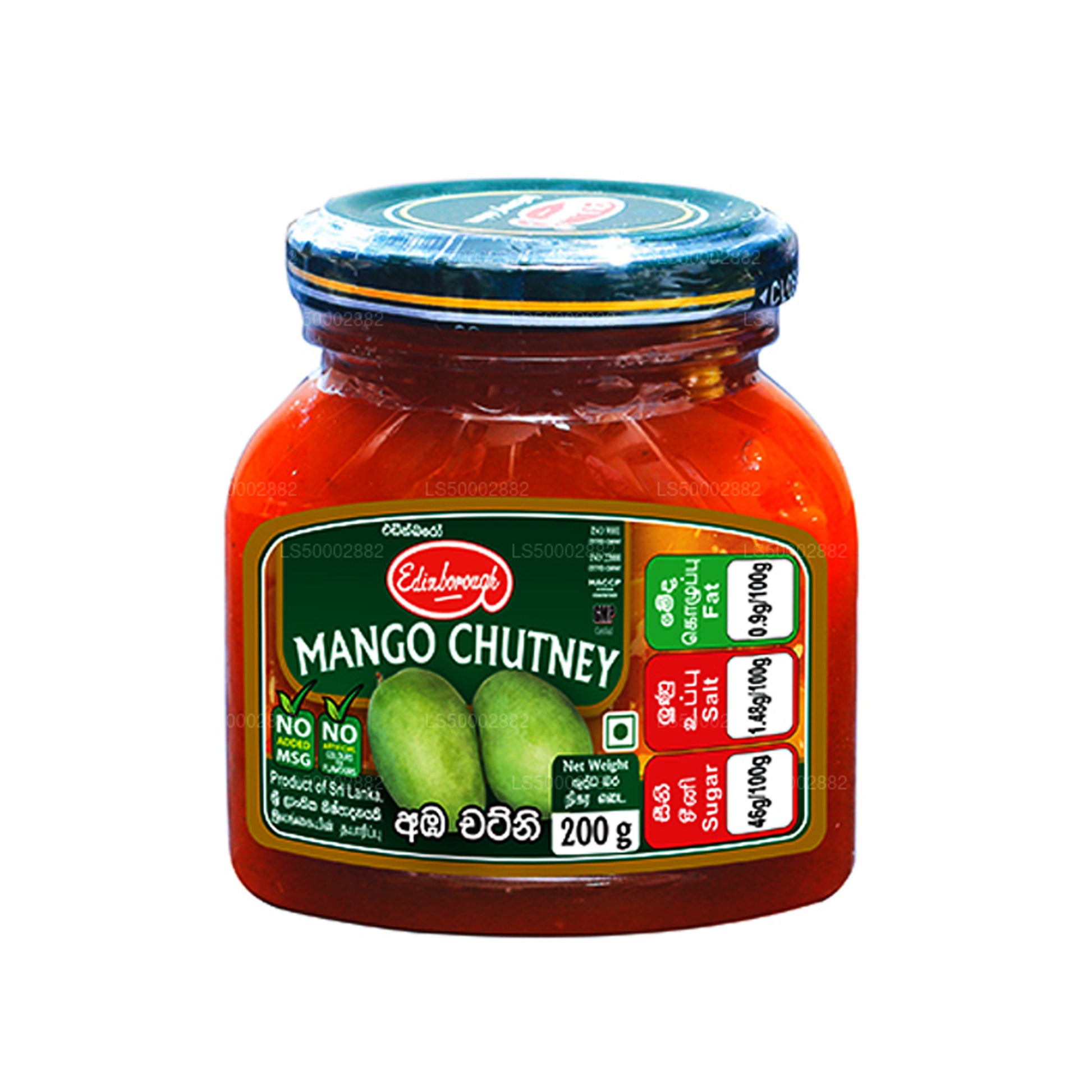 Ingrediënten: stukjes mango, suiker, water, gelodiseerd keukenzout, chilipoeder, xanthaangom, azijnzuur (INS 260), gember, knoflook, kruidnagelpoeder, specerijen en toegestaan conserveermiddel voor levensmiddelen (INS 211).