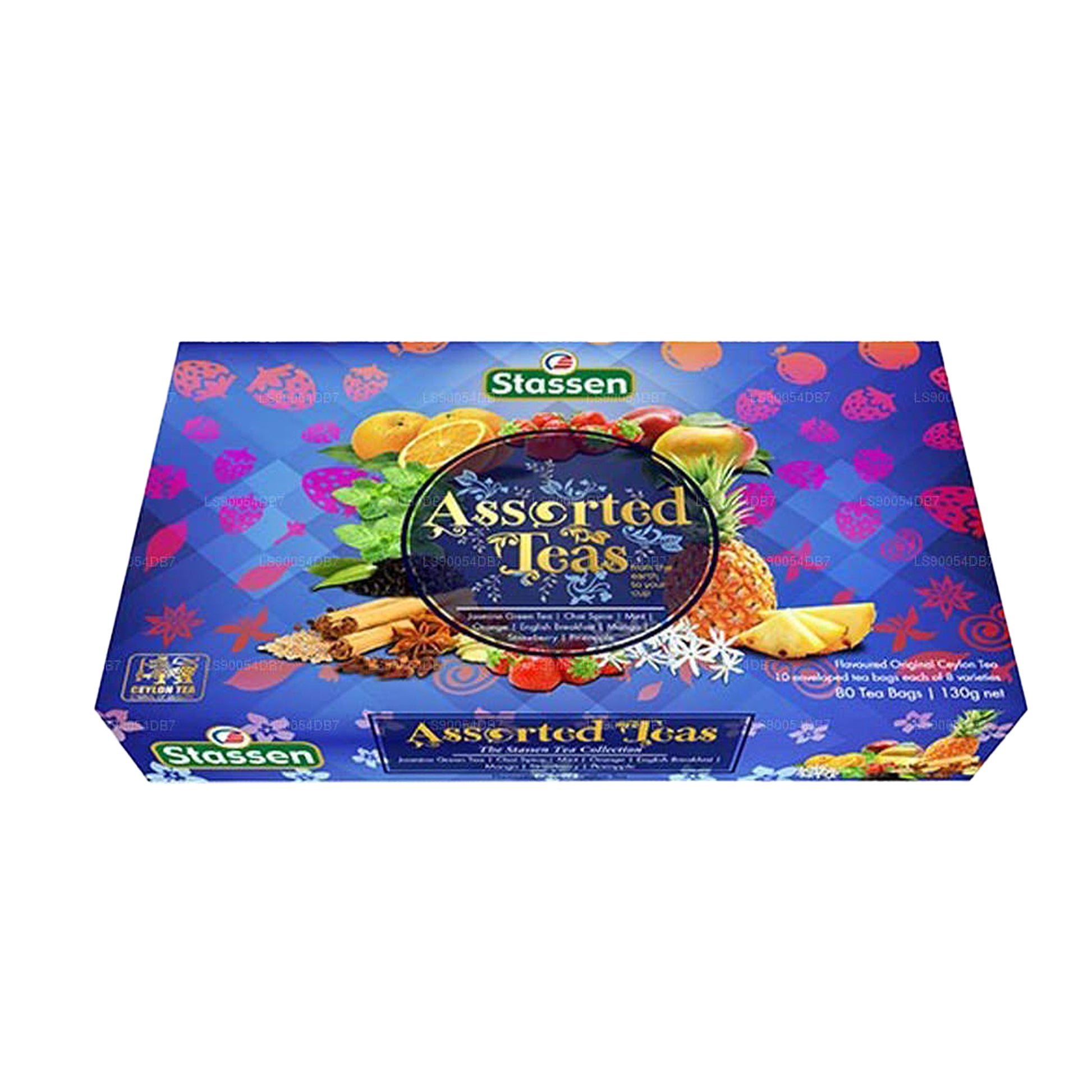 The Exclusive Stassen Assorted Gift Pack features 80 enveloped tea bags, offering a delightful selection of eight unique flavors in one beautifully presented box. This premium assortment includes Jasmine, Chai Spice, Mint, Orange, English Breakfast, Mango, Strawberry, and Pineapple teas—each individually wrapped to preserve freshness and aroma. Whether you prefer the soothing essence of jasmine, the invigorating kick of mint, or the tropical sweetness of mango and pineapple, this gift pack delivers a tea for every taste and occasion. Perfect for gifting or personal indulgence, it’s a celebration of flavor and variety in every cup.