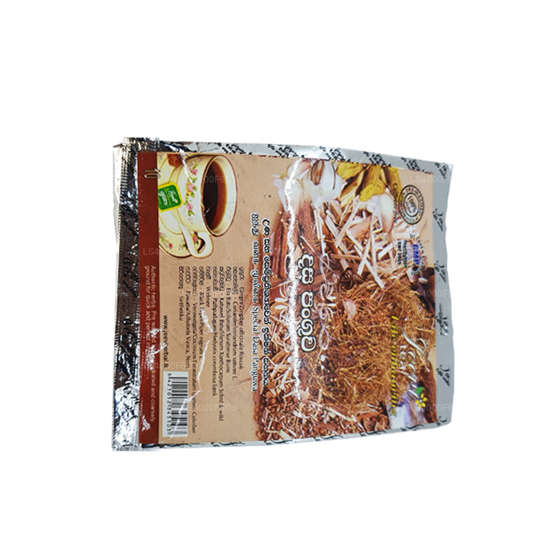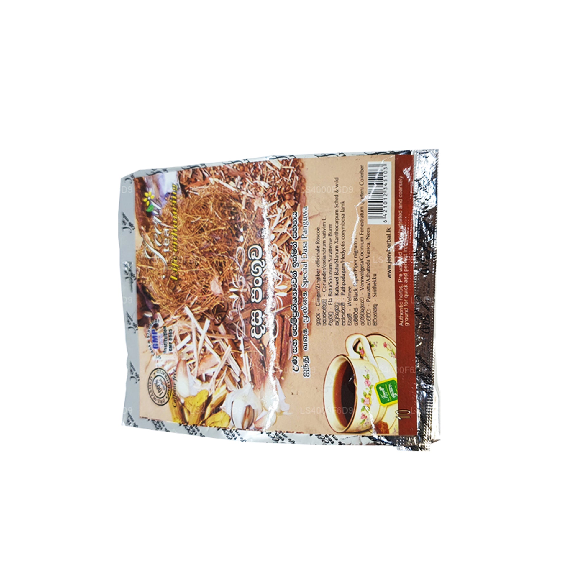 (SKU: LS4000F6D9) „Jeevi Dasapanguwa - Ten Mix” is een kruidenmengsel uit Sri Lanka dat tien verschillende kruiden bevat die traditioneel worden gebruikt in de Ayurvedische geneeskunde. Er wordt aangenomen dat het spijsverterings-, ontgiftende en immuunversterkende voordelen biedt en wordt meestal geconsumeerd als thee of afkooksel. Hoewel het in traditionele praktijken gewaardeerd wordt, is het raadzaam om voor gebruik een zorgverlener te raadplegen.
