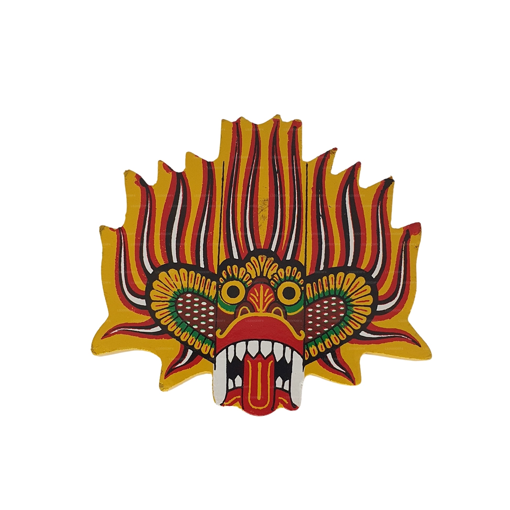 Ginidal Raksha Masker De koelkastmagneet is een levendige weergave van een van Sri Lanka's traditionele Raksha-maskers, die bescherming en kracht symboliseert. Het Ginidal Raksha-masker, bekend om zijn felle uitdrukking en kleurrijke details, zou negatieve energieën verdrijven en geluk brengen. Deze miniatuurversie, met zorg en aandacht voor detail vervaardigd, legt de kunst van Sri Lankaans vakmanschap vast. Ontworpen als koelkastmagneet, combineert het cultureel erfgoed met alledaagse functionaliteit, waardoor het een betekenisvol souvenir of decoratieve toevoeging is aan uw huis of werkplek.