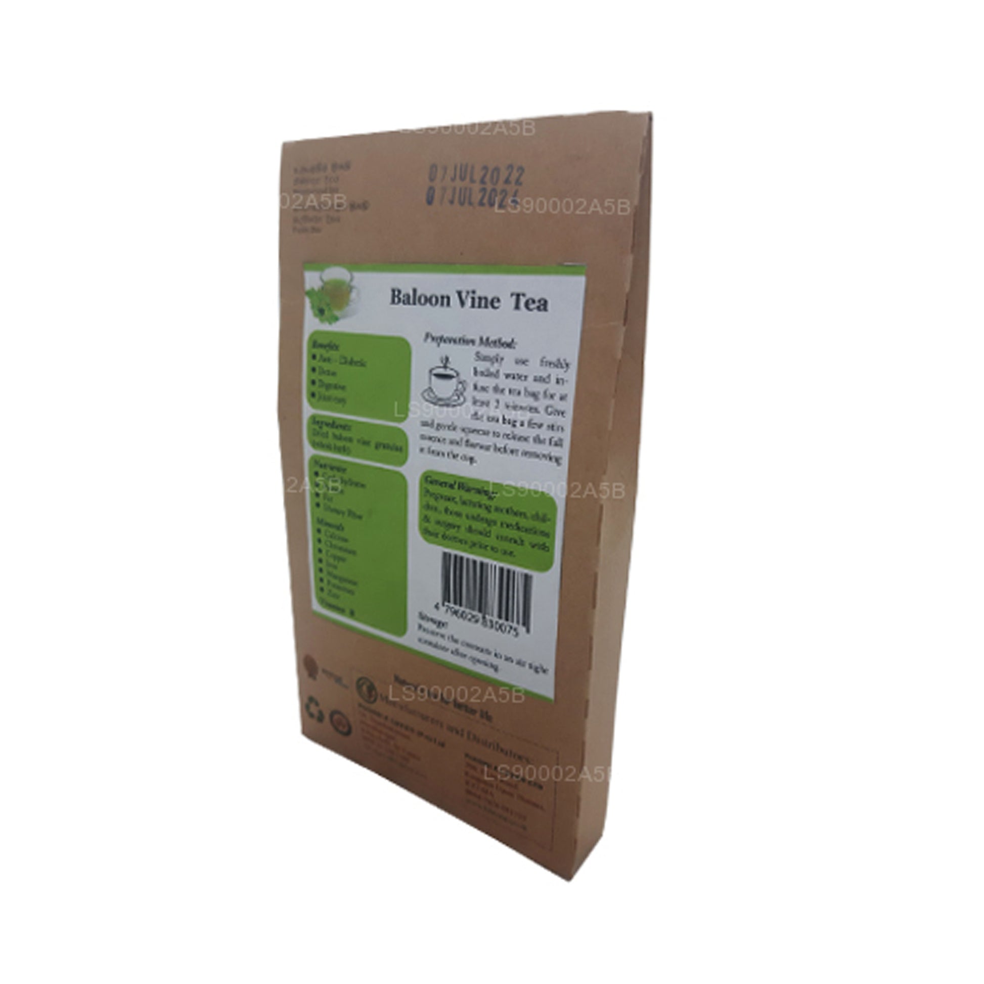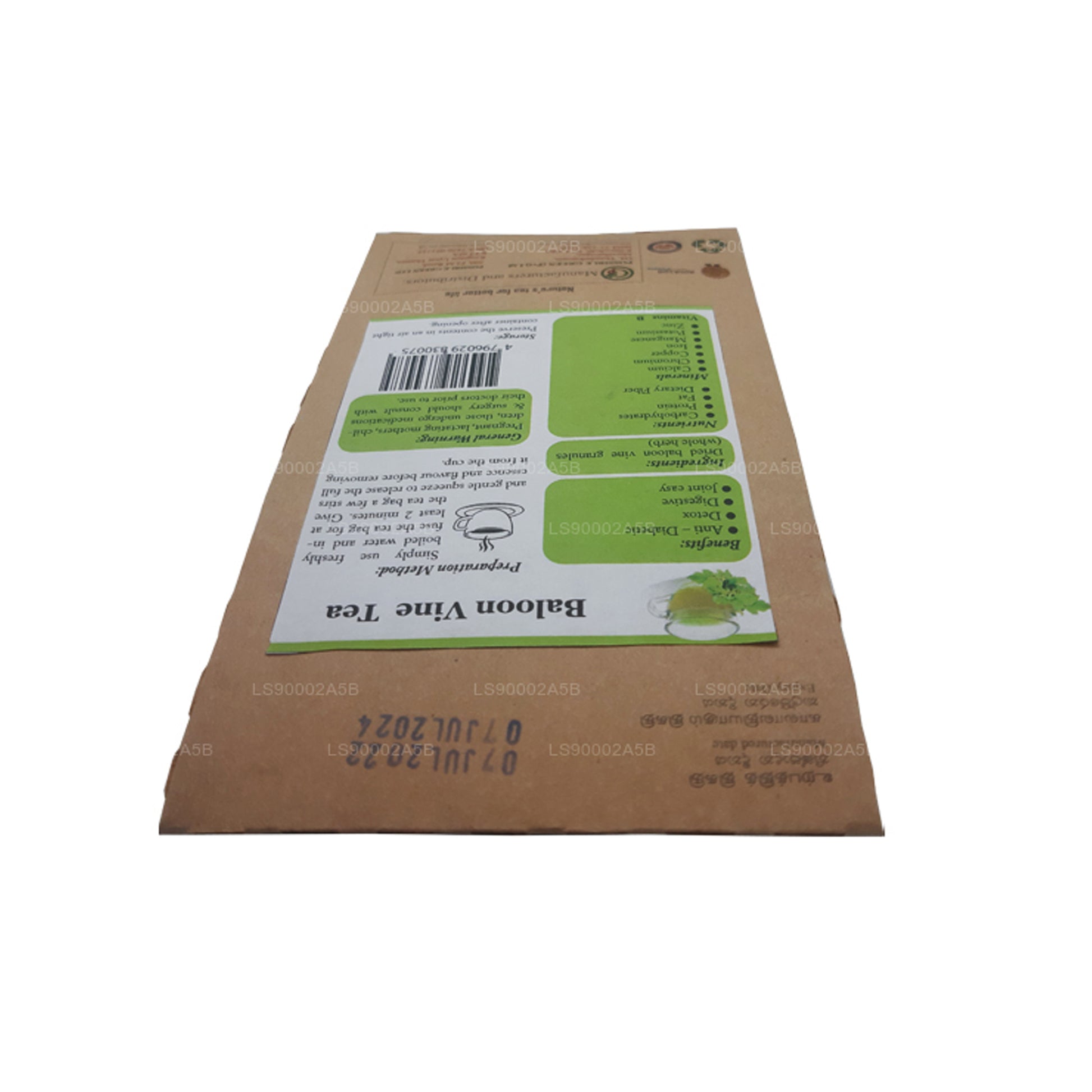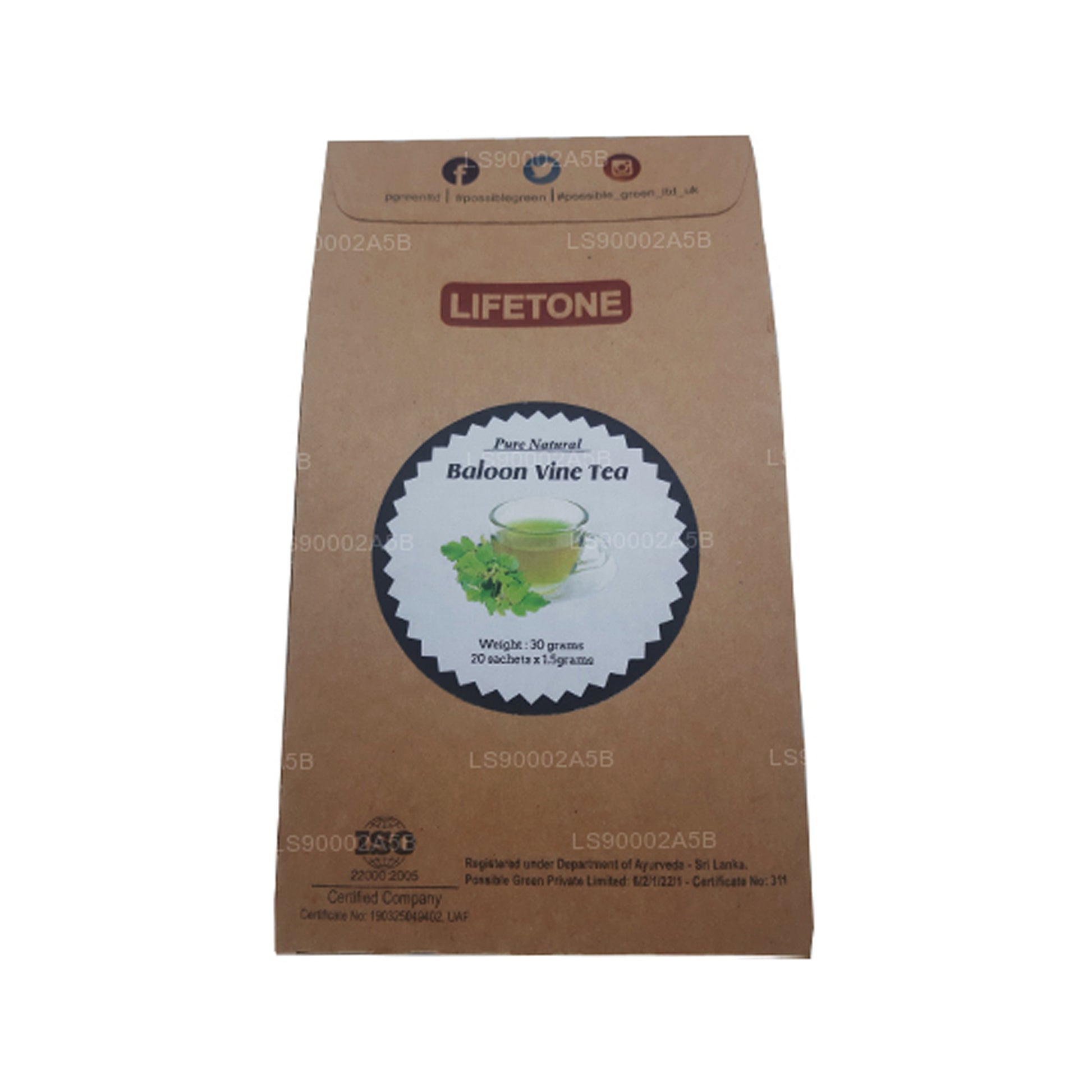 Lifetone Balloon Vine Tea (30 g) met 20 theezakjes is een natuurlijke kruideninfusie gemaakt van gedroogde ballonwijnstokkorrels, gewaardeerd om zijn antidiabetische, ontgiftende, spijsverterings- en gewrichtsondersteunende voordelen. Het is rijk aan koolhydraten, eiwitten, vetten, voedingsvezels, calcium, chroom, koper, ijzer, mangaan, kalium, zink en vitamine B en biedt een voedende wellnesservaring. Laat ter voorbereiding een theezakje minstens 2 minuten in vers gekookt water trekken, roer en pers zachtjes voor een volle smaak voordat je het eruit haalt. Na opening in een luchtdichte verpakking bewaren