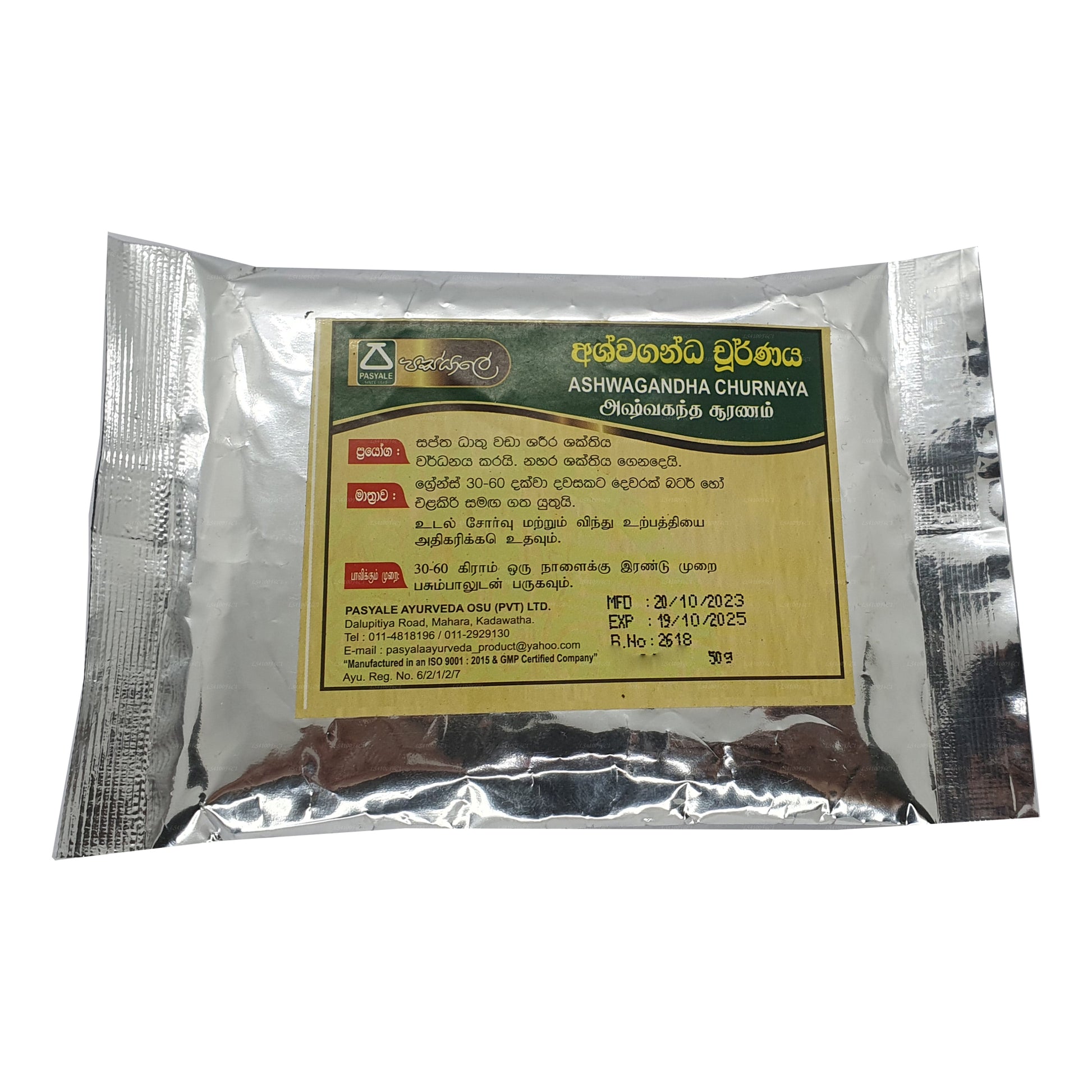 Pasyale Ashwagandha Choornaya is a significant quantity of powdered Ashwagandha (Withania somnifera) root. Ashwagandha Choornaya is a classical Ayurvedic herbal formulation widely used for its adaptogenic properties, which help the body manage stress and promote overall well-being.