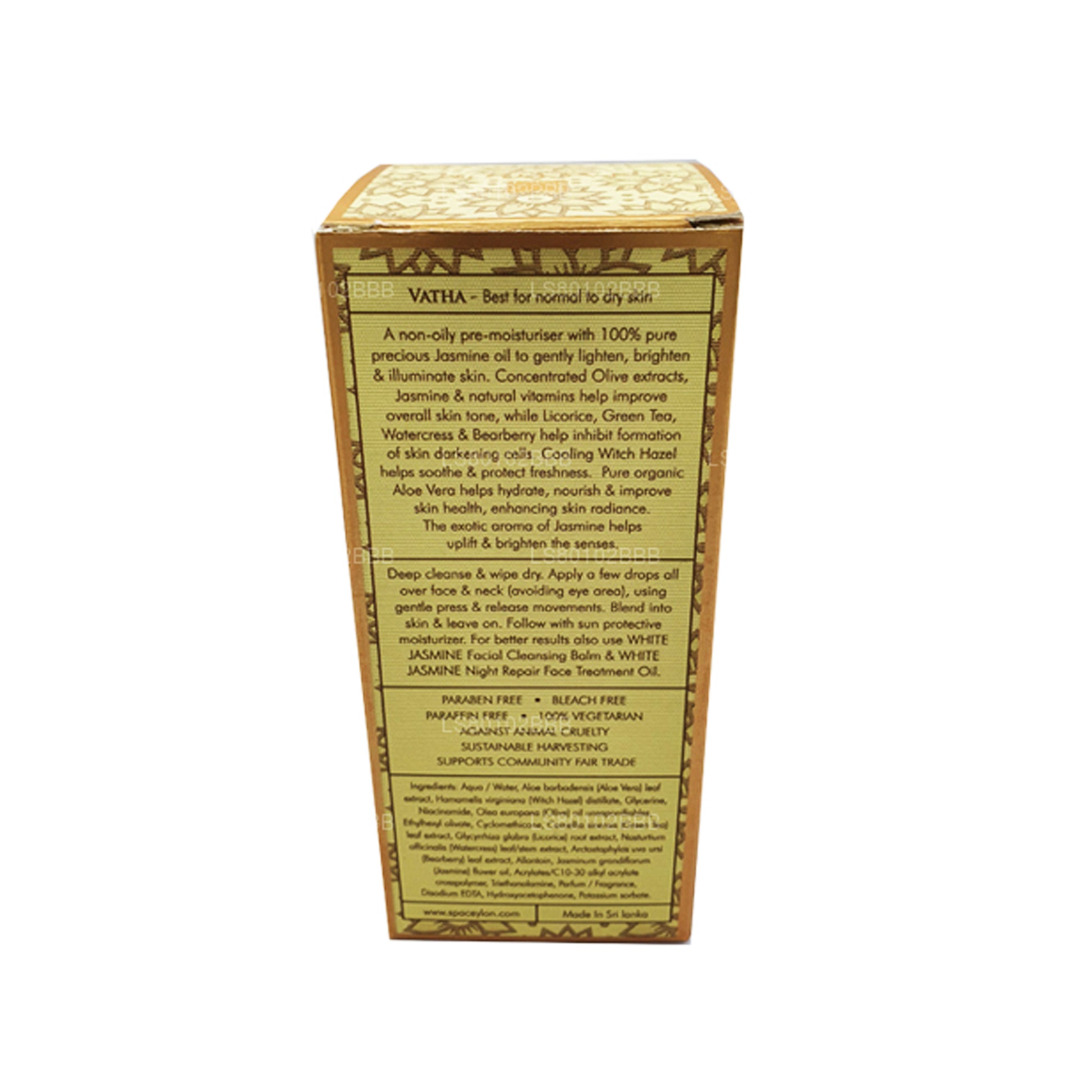 (SKU: LKZ0910139) Een niet-vette voorvochtinbrengende crème met 100% pure kostbare jasmijnolie om de huid zacht te verhelderen en te verlichten. Geconcentreerde olijfextracten, jasmijn en natuurlijke vitamines helpen de algehele huidskleur te verbeteren, terwijl zoethout, groene thee, waterkers en beredruif de vorming van huidverdonkerende cellen helpen voorkomen. Verkoelende toverhazelaar helpt de frisheid te kalmeren en te beschermen. Pure biologische aloë vera helpt de huid te hydrateren, te voeden en de gezondheid te verbeteren, waardoor de huid stralender wordt De exotische geur van jasmijn helpt de zintuigen te verlevendigen en te verhelderen.