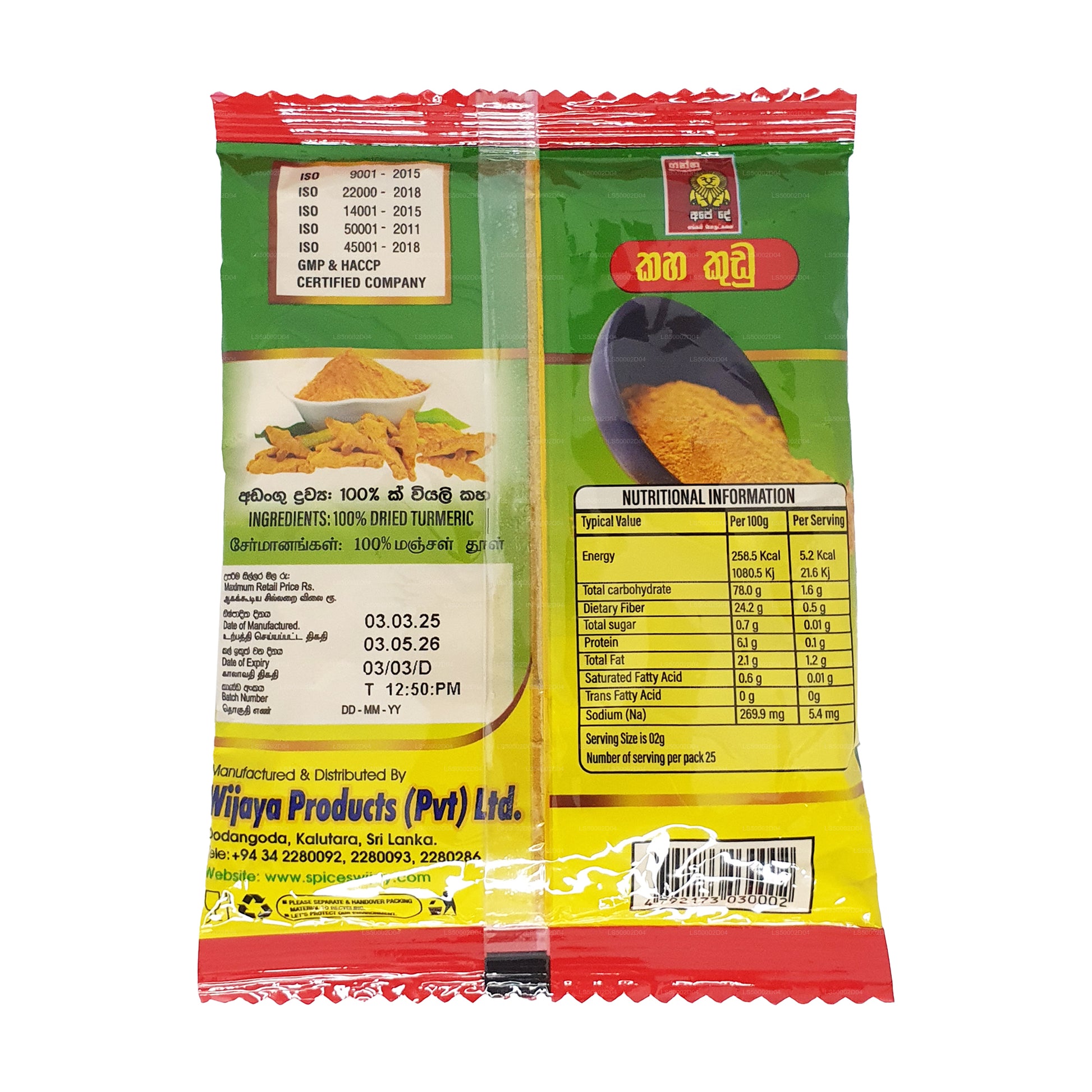 (SKU: LS5000C93C) Geproduceerd met hoogwaardige knollen van de plant Curcuma longa. Het malen gebeurt in een molen, speciaal ontworpen voor het malen van kurkumaknollen, onder strikte hygiënische omstandigheden. Het product is hygiënisch verpakt in gelamineerde zakjes om de versheid gedurende een lange periode te behouden